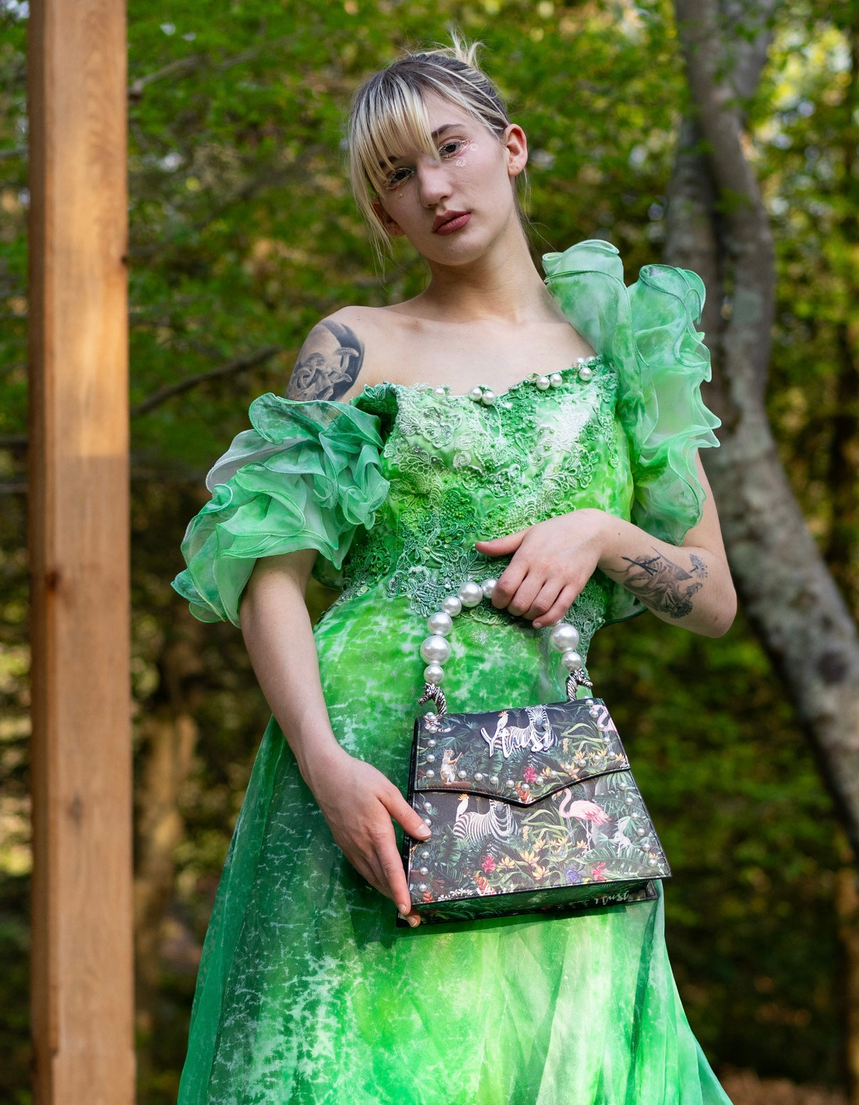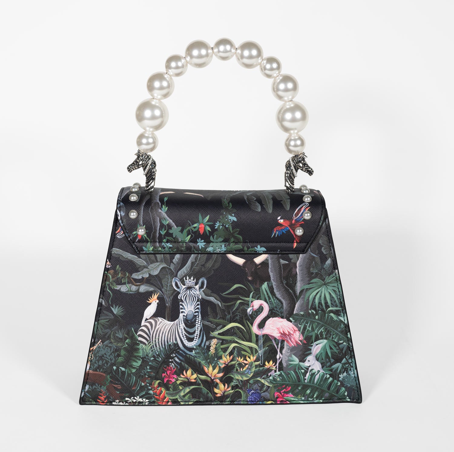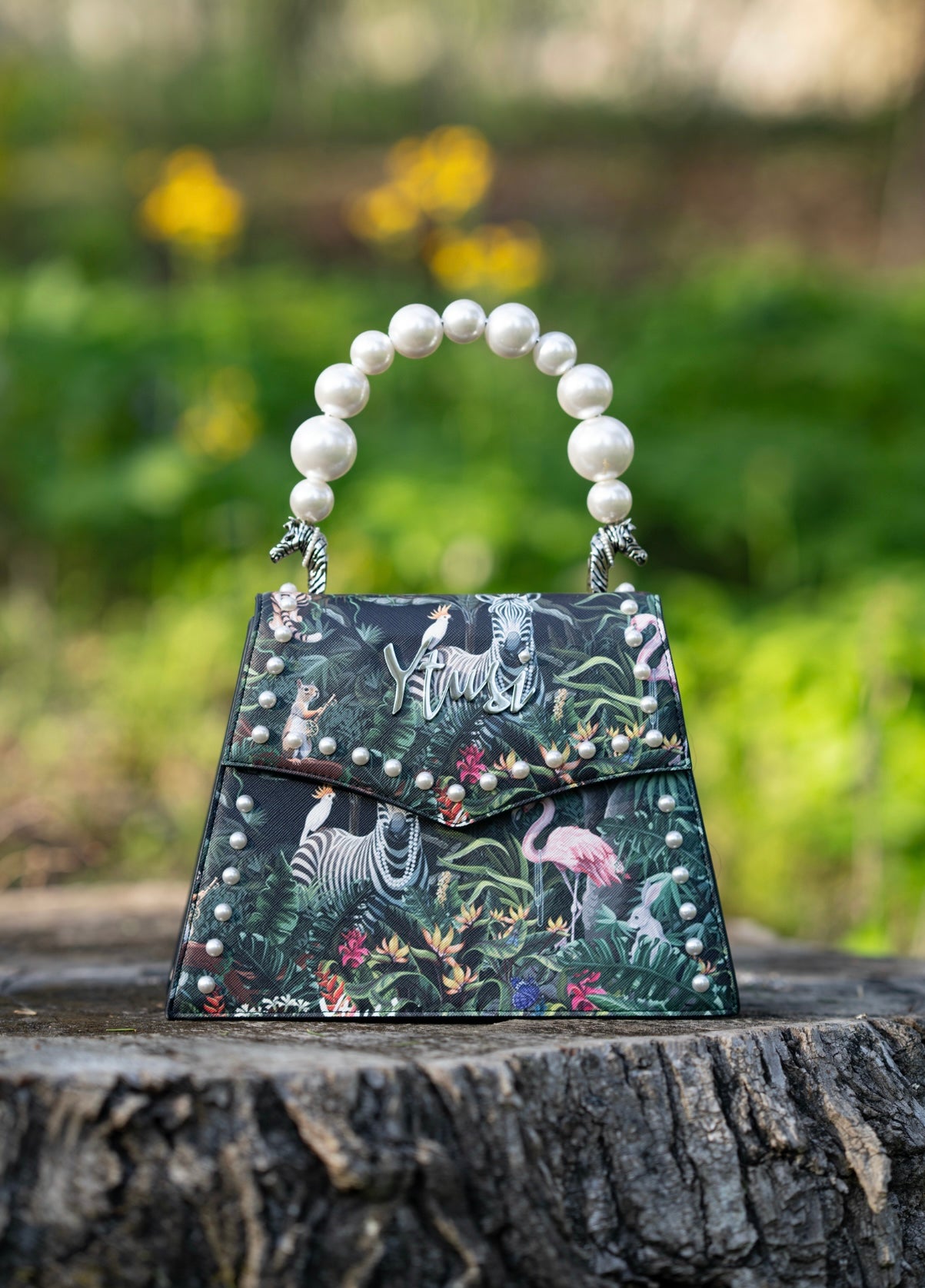 Step into the untamed beauty of the jungle with the "Jungle Pearla", an extraordinary handbag that combines wild luxury with unparalleled sophistication. Crafted from custom YTUSI vegan leather, this unique bag features dynamic jungle-inspired artwork that showcases the vibrant colors and fierce spirit of the wild. The striking design is complemented by lustrous white pearls adorning the handle, strap, and accompanying coin purse, adding a touch of luxury and refinement.